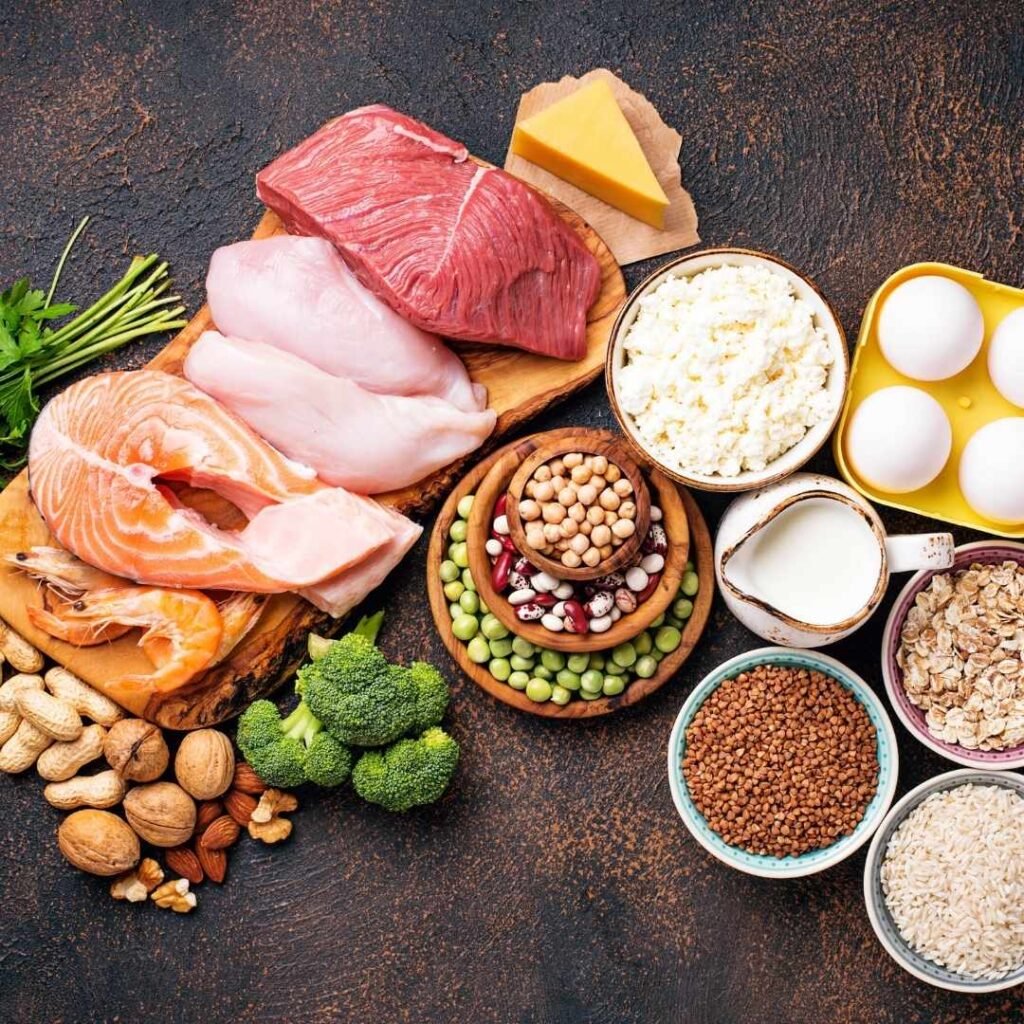 Exemplos de alimentos: carne, peixe, ovos, laticínios, nozes e sementes.