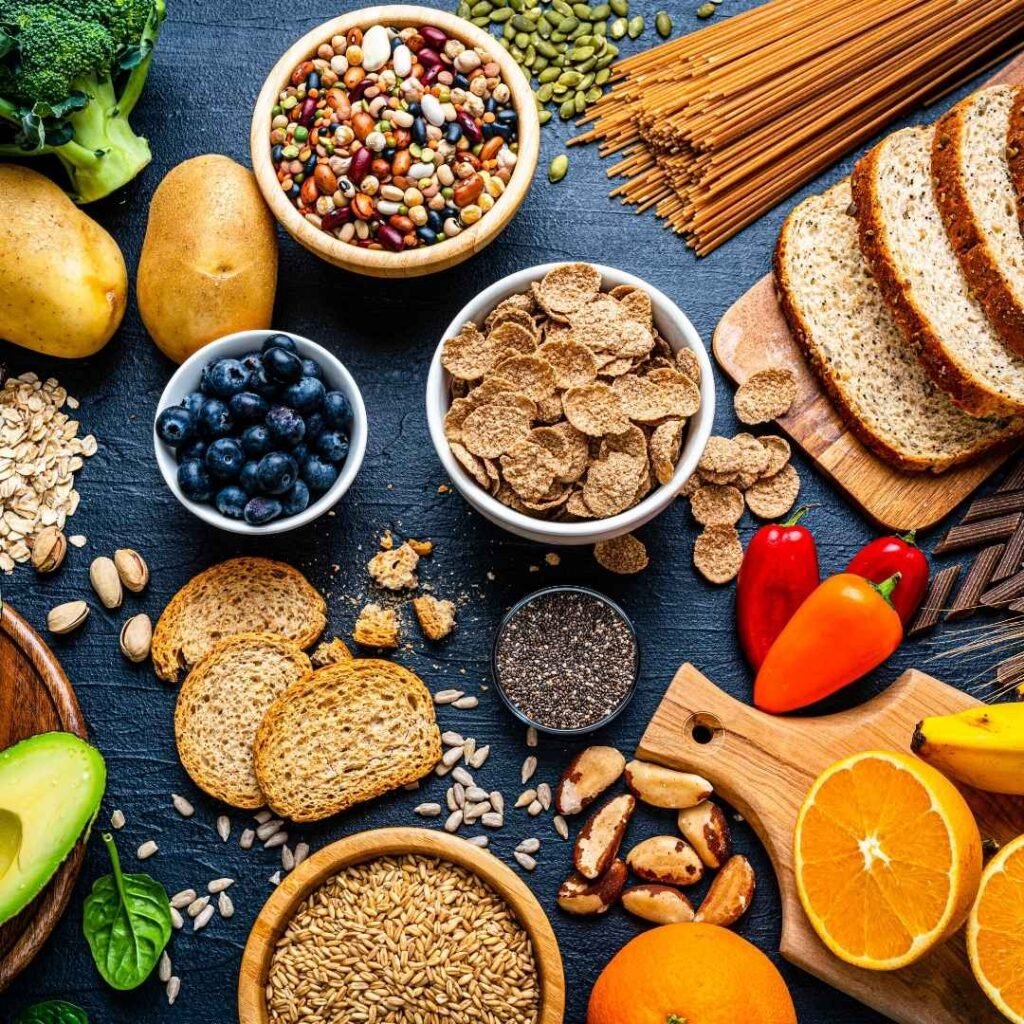 Exemplos de alimentos: grãos integrais, frutas, verduras, legumes e sementes.